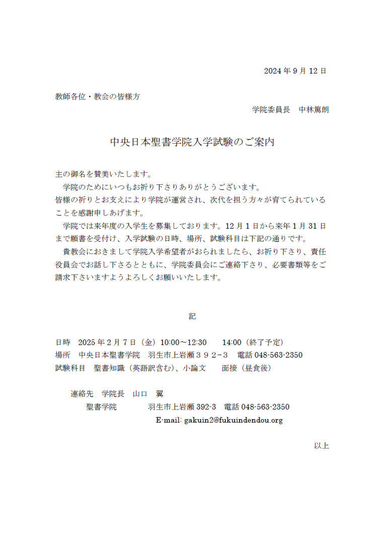 つきましては、「中央日本聖書学院入学試験のご案内」をご覧ください。